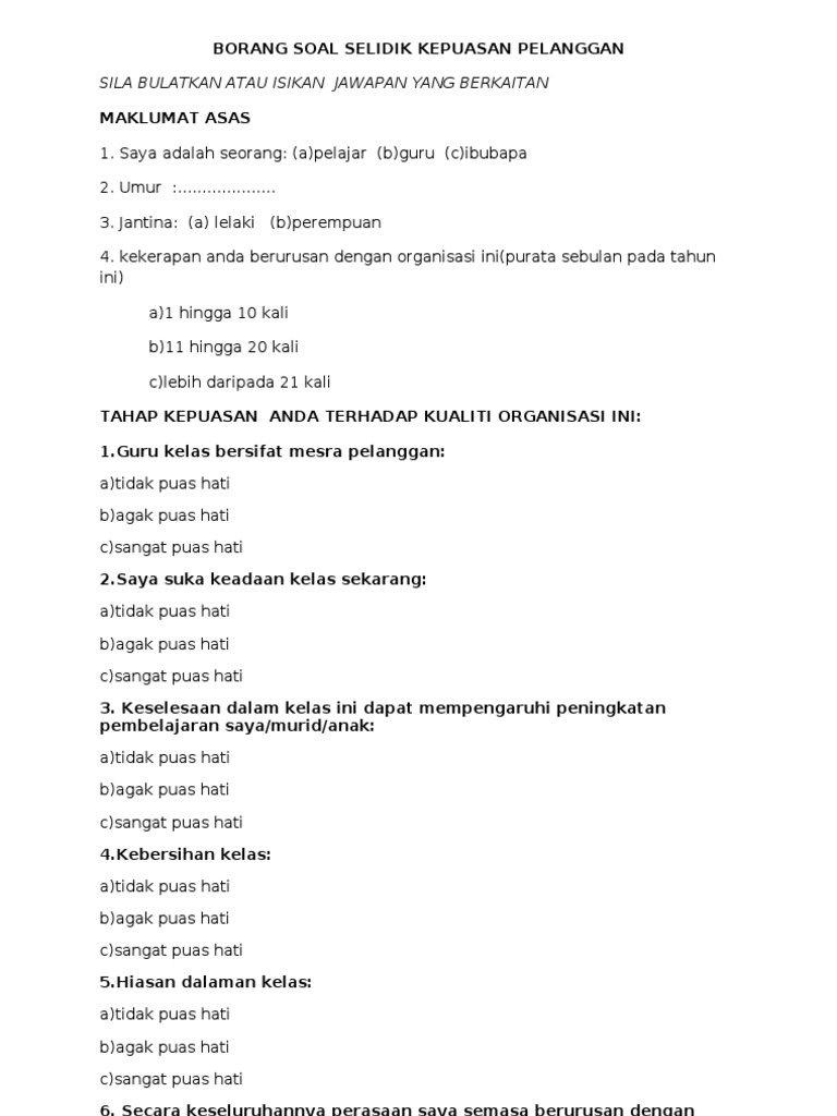 Contoh Soalan Survey Kepuasan Pelanggan Terengganu Z from imgv2-2-f.scribdassets.com Kepuasan pelanggan adalah perbandingan antara kinerja yang diharapkan oleh pelanggan dibandingkan dengan kinerja aktual di lapangan. Survey kepuasan pelanggan no.dok : So please help us by uploading 1 new document or like us to download Contoh kuesioner penelitian, skripsi, kinerja karyawan, kepuasan pelanggan, terbuka, kualitas pelayanan, pemasaran, produk, keputusan pembelian, akuntansi, evaluasi kegiatan, gaya kepemimpinan, kinerja pegawai contoh kuesioner kepuasan pelanggan | sumber : Survey dilakukan untuk meningkatkan kinerja setiap komponen dalam organisasi. Savesave contoh survey kepuasan pelanggan for later. Recommend reading this get cash for contoh survey kepuasan pelanggan tips. Kepuasan pelanggan merupakan komponen utama bisnis.