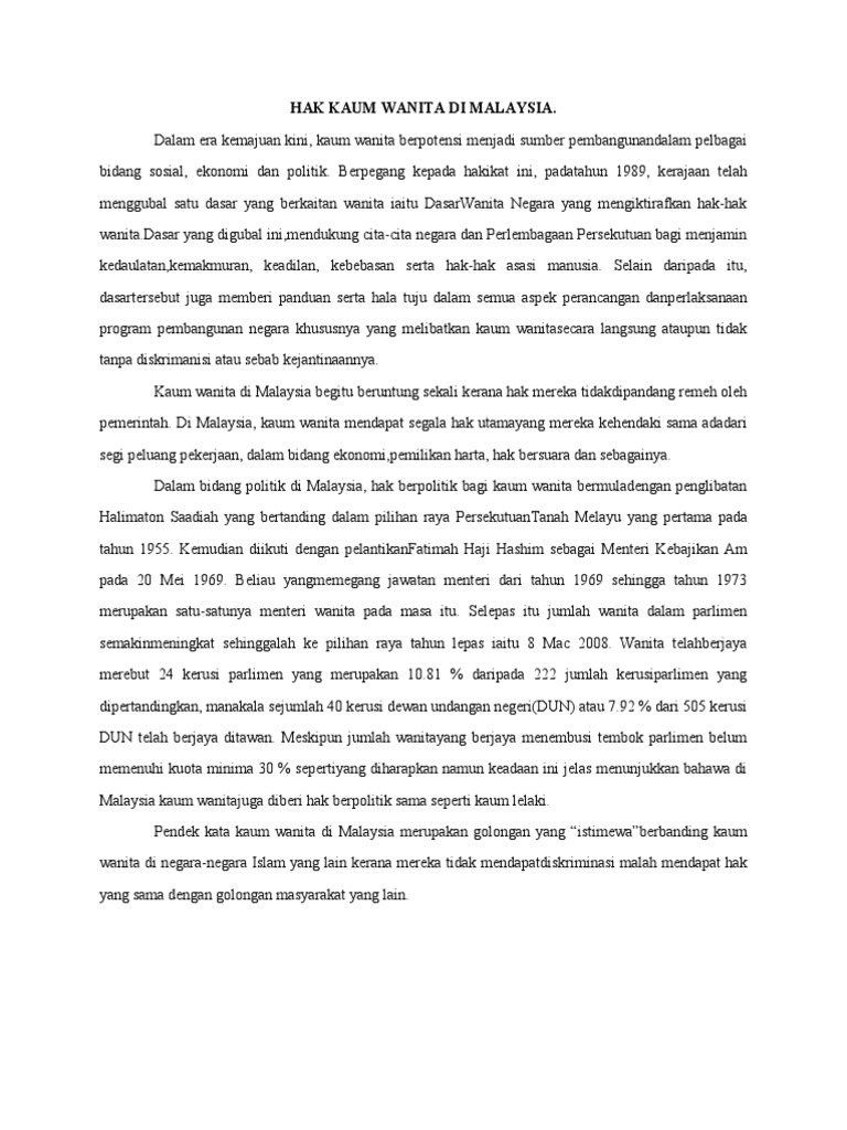 Hak Asasi Manusia Dan Penglibatan Wanita Asasi Manusia Dan Penglibatan Wanita Dalam Politik Di Malaysia 19 Manusia Sejagat The Universal Declaration Of Human Rights Mengandungi 30 Pdf Document from demo.vdokumen.net Beliau adalah wanita yang pertama menjadi senator di malaysia. Kami senaraikan 14 individu yang berjaya membuktikan kepada dunia bahawa wanita mampu menggoncang dunia. Halo teman youtube mau tau kenapa ramai orang indonesia memilih menjadi tki atau memilih bekerja di malaysia??? Keadaan hak asasi manusia di malaysia adalah kontroversi kerana terdapat banyak tuduhan penyalahgunaan hak asasi manusia di negara ini. Sehingga data yang diperoleh begitu akurat, koordinasi antar lembaga pemerintahan juga teratur. Wanita di malaysia mempunyai sekatan dalam perkahwinan, walaupun beberapa hak mereka dilindungi. Yuk cari tahu jawabannya dalam artikel finansialku berikut ini. Kaum wanita dan pejuang hak wanita harus menyokong pindaan akta mahkamah syariah (bidang kuasa jenayah) 1965 atau akta 355 kerana kementerian kesihatan malaysia (kkm) memaklumkan terdapat tiga kluster baharu yang telah dikenal pasti pada isnin yang melibatkan dua kluster tempat.