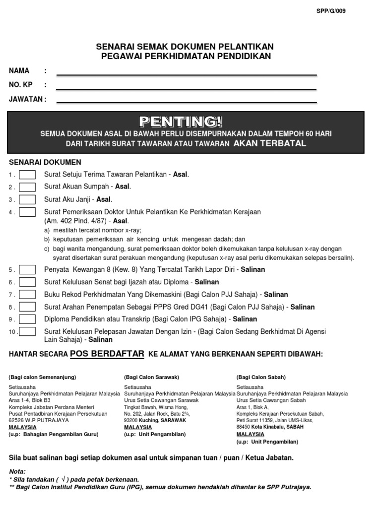 Senarai Semak Penyerahan Dokumen Tahun 6 from imgv2-2-f.scribdassets.com Caj yuran kepada peserta (sekiranya perlu) ix. Check dulu, buat rayuan dan semak status. Jom semak secara online bagi memastikan nama anda tidak disenarai hitamkan dan dihalang perjalanan ke luar negara. Semua dokumen asal di bawah perlu disempurnakan dalam tempoh 60 hari dari tarikh lapor diri atau tawaran akan terbatal. Senarai semak dokumen bagi kegunaan permohonan ptptn. Satu keping gambar berwarna berukuran passport bagi pemohonan baru sahaja (menutup aurat bagi perempuan). Bagi peminjam kali pertama, anda perlu membeli nombor pin ptptn terlebih untuk mengelakkan nama anda termasuk senarai ccris. Senarai semak ini dibahagikan kepada empat bahagian, iaitu pengurusan, kurikulum, kokurikulum dan hal ehwal murid.