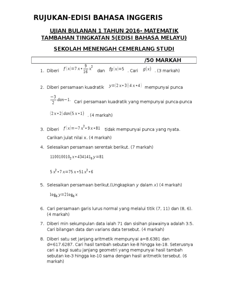 Senarai kertas soalan dan skema jawapan trial spm untuk mata pelajaran matematik ini akan dikemaskini. .1, soalan kbat bijih timah, soalan kbat konsep tamadun, soalan kbat kemahiran hidup, soalan kbat matematik tingkatan 2, soalan kbat sejarah tolak tahun 5, soalan kbat dasar ekonomi baru, soalan kbat pendidikan islam pt3, contoh soalan kbat tahun 4, koleksi soalan kbat biology spm, jawapan. Soalan percubaan spm 2017 bahasa melayu negeri selangor via www.sistemguruonline.my. Руслан агоев уходи petrucho demo. Perlawanan persahabatan bola jaring laman rasmi smk khir via smkkj.edu.my. Sukatan pelajaran matematik tambahan ting.4 via www.slideshare.net. Soalan percubaan spm 2017 matematik tambahan negeri via www.sistemguruonline.my. Special edition untuk tadau kaamatan! (9) formula algebra (algebraic formulae) ! Contoh soalan kbat matematik kemahiran berfikir aras tinggi via mypt3.com. Mengandungi koleksi soalan kbat untuk pt3. Contoh soalan kbat sejarah tingkatan 4 bab 6 kertas 3 via. The full answer scheme would be included in upcoming pdf version of addmath.