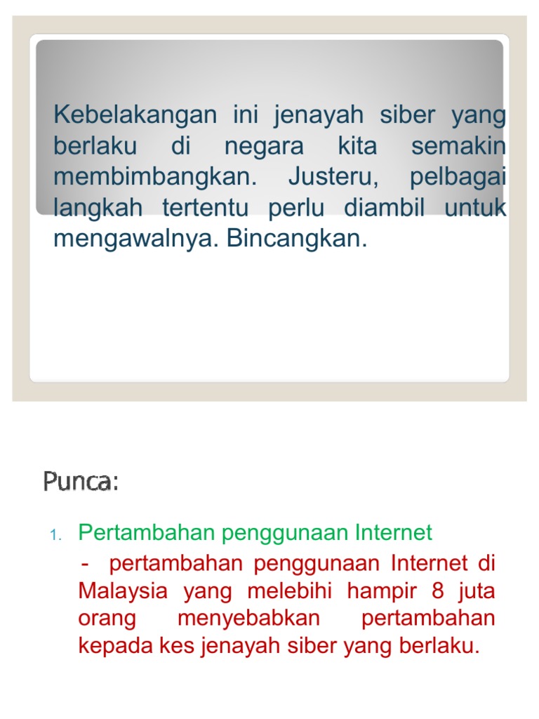 Boleh jadi seseorang itu memerlukan wang dan berada dalam kesempitan hidup. Jenayah siber (punca dan langkah mengatasi) hukuman. Kes jenayah ini berlaku disebabkan berpunca dari desakan hidup seseorang itu. Jenayah siber ini akan berlaku adalah disebabkan oleh beberapa factor yang penting.antara punca yang berlakunya jenayah siber ialah kemunculan internet sebagai alat komunikasi terkini. Bekerjasama secara multilateral dalam membanteras jenayah siber.