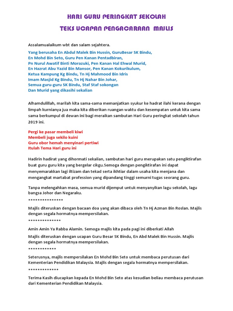 Pembacaan teks pancasila diikuti oleh 8. Majlis sambutan hari guru peringkat sekolah magone 2016 via sjktbandarspringhilnbd2045.blogspot.com. Teks ucapan yb menteri pendidikan sempena majlis permuafakatan kpm da. Program sambutan hari guru 2019 pages 1 5 text version anyflip. Penetapan tanggal ini berdasarkan tanggal lahir tokoh pendidikan nasional, ki hajar dewantara.